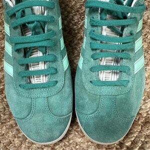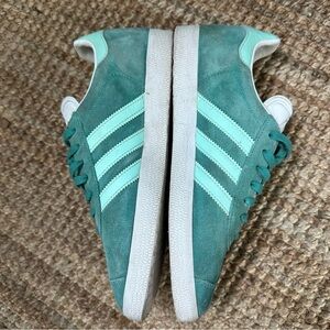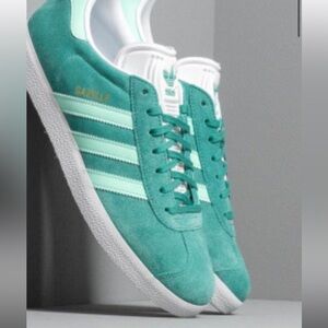 Stylish Adidas Gazelle sneakers. Features teal suede with white accents. Iconic three stripes design.
