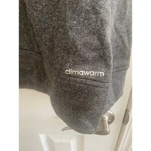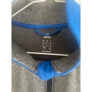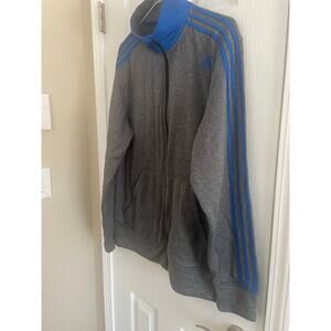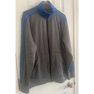 Stylish adidas jacket. Features gray body with blue accents. Comfortable and sporty design.