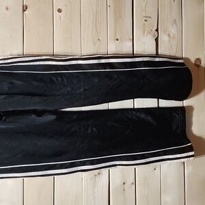 Classic Adidas black sweatpants with iconic white stripes. Features adidas logo. Kids size