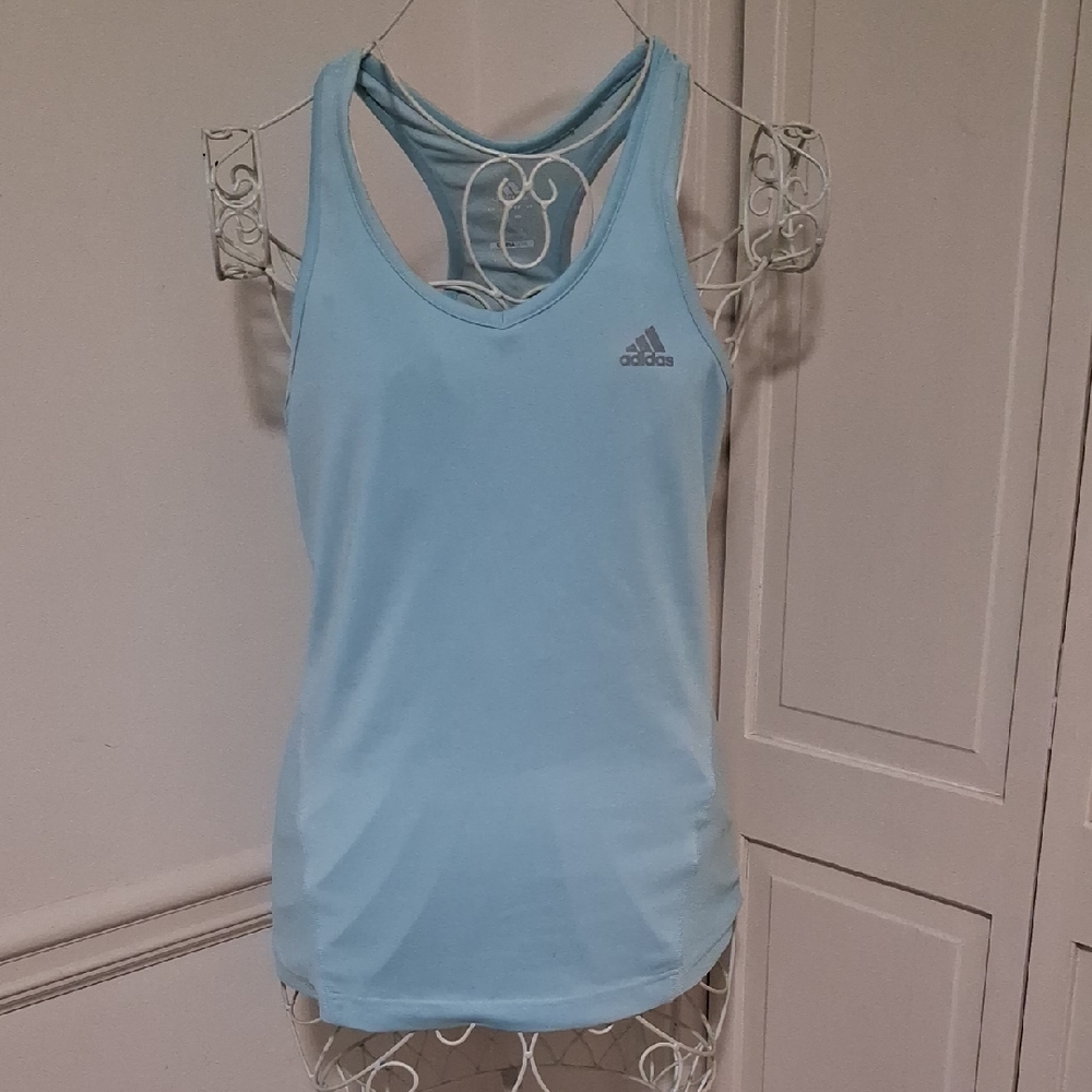 Women's adidas racerback tank in light blue. Moisture-wicking athletic fabric for workouts. Small adidas logo on chest. Streamlined sporty silhouette.