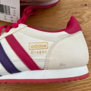 Brand new in box! adidas Originals Dragon shoes. Very RARE!! Color is White/Bright Pink/Power Purple. Ortholite insoles. Size Mens/Youth 6. Women's US 7. Please see size chart.
