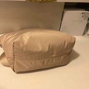 A shopper-style tote bag in a puffed design made in part with recycled content from production waste. Multiple zip pockets keep small items separate, good clean condition adjustable straps short and long straps are in great conditions