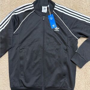 Stylish Adidas jacket. Features white stripes on sleeves. Embroidered logo on front.