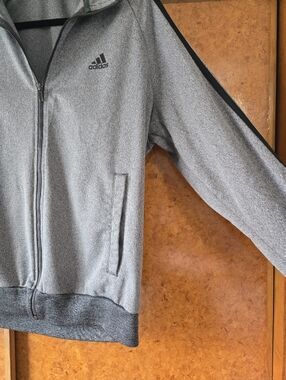 Lightweight performance jacket with full zipper. Signature three-stripe detailing on sleeves. Side zip pockets for storage. Ribbed hem and cuffs for a secure fit. Subtle embroidered adidas logo on chest.