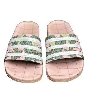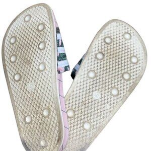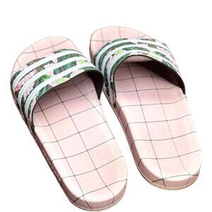 Stylish pink slide sandals with floral accents. Comfortable and trendy design. Perfect for casual wear.