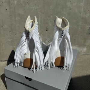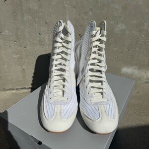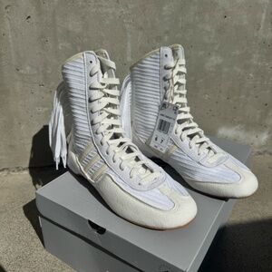 adidas by Stella McCartney's 'Rasant V3' sneakers are modeled after vintage racing sneakers - specifically the sportswear label's 'Monza' style, which was worn by renowned racecar driver Mario Andretti in the '70s. Made from white canvas, they trimmed with vegan material and have calf-length cuffs traced with swishy, fringe-like laces.
