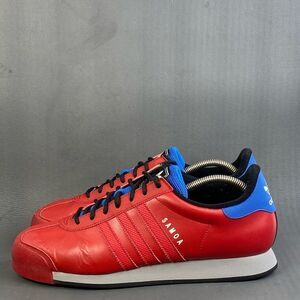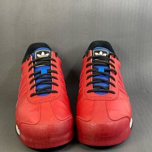 Stylish adidas athletic shoes. Vibrant red with blue accents. Comfortable and durable design.