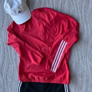 Windbreaker Jacket features of zip up neck with mock collar. The iconic adidas three stripes are on the right side of the jacket and on the top left. Jacket also features and elastic waist, bracelet sleeves, a subtle adidas logo on the front...left side, and hidden zip pocket on the right side on the back. The zip pocket is large enough to hold an ID card and keys.
