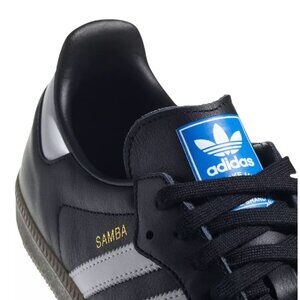 Classic adidas Samba sneakers. Black leather with white stripes. Gum sole for traction.