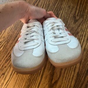 Stylish adidas Samba OG sneakers. White leather with coral stripes. Perfect for everyday wear.