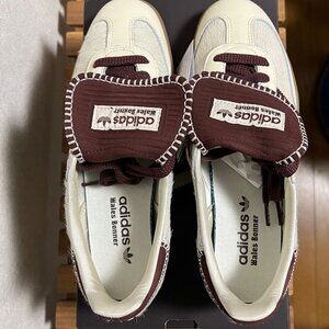Classic Adidas Samba sneakers. White leather with burgundy accents. Comfortable and stylish for any occasion.