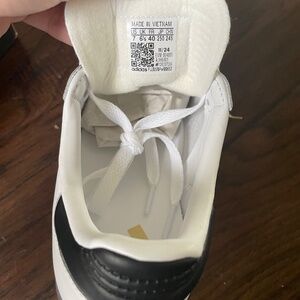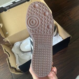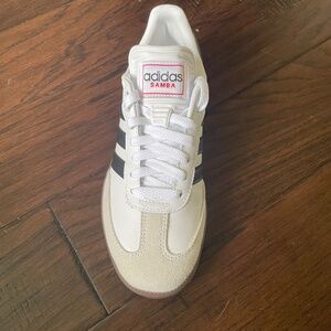 Classic adidas Samba sneakers. White leather with black stripes. Comfortable and stylish.