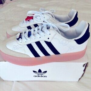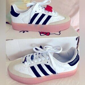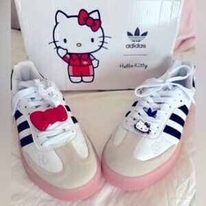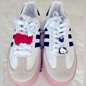 The adidas Sambae Hello Kitty (Women's) pays homage to the iconic cat character created by Yuko Shimizu for Sanrio through Hello Kitty-themed details and colors.