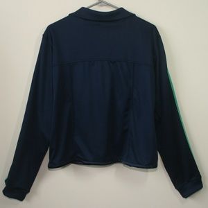 This classy adidas full-zip jacket is youth size XL. The chest measures 21” at the armpits and from the shoulder to cuff about 26 inches laying flat. This is EUC with only one or two minor pulls in the fabric, and some wear evident on the zipper.