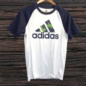 Stylish adidas tee with bold logo. White body with navy sleeves. Comfortable and breathable fabric.