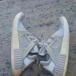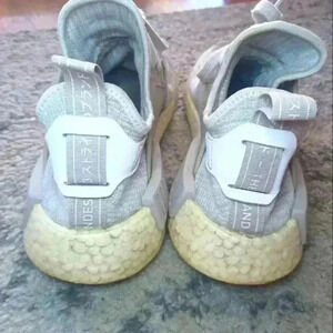 adidas Womens Cream and Grey NMD XR1 Primeknit Pearl Grey 7. In great preowned condition. NO INSOLES. Some scuffing but shown in photos. A couple small stains but shown in last few photos. The adidas NMD XR1 gets a light and soft look just in time for summer with this upcoming colorway in “Pearl Grey”. In a lightly contrasting glitch camo motif across the Primeknit upper in white and grey shades with matching cage and heel bumpers. The result is a perfect feminine rendition to get the lady NMD fans through summer in style.
