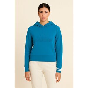 adidas hoodie, women’s turquoise hoodie, adidas cotton polyester hoodie, embroidered logo sweatshirt, pullover hoodie XS, casual sporty top, adidas striped cuff hoodie, vibrant blue hoodie, women’s athleisure, relaxed fit sweatshirt, signature adidas style
