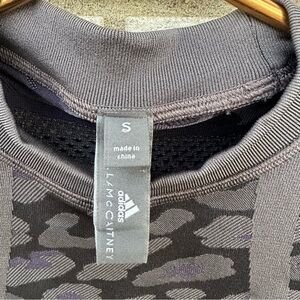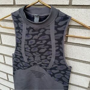 A striking adidas by Stella McCartney tank for your workout wardrobe, outfitted with a mesh panel for extra breathability and detailed with leopard spots for a touch of bold style. Lightweight activewear jersey. Ribbed crew neck. Leopard and mesh panels. Logo hem. Shell: 71% polyester/21% nylon/8% spandex. Size S. Excellent used condition.