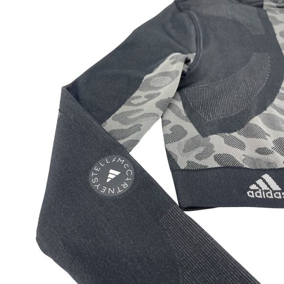 Keywords: adidas by stella mccartney top, stella mccartney camo crop, leopard print workout top, gray black long sleeve crop, seamless activewear top, designer athletic shirt M, gym crop top women