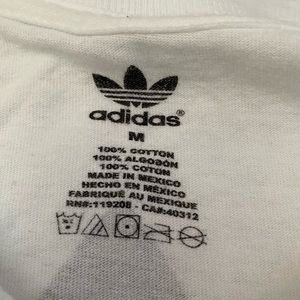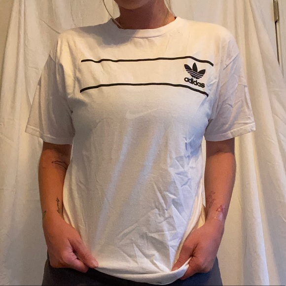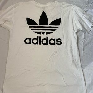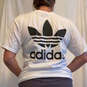 DETAILS: white tshirt with adidas logo screen printed on the front and back in black. i loved this shirt it’s so easy to dress up or down and it’s so comfortable. no stains or discoloration.