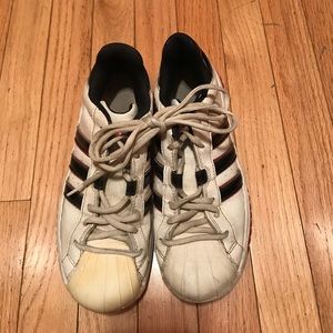 white adidas sneakers. black stripes w/ red trim. us women's size 5 - fits like a 6. worn often, in decent shape.