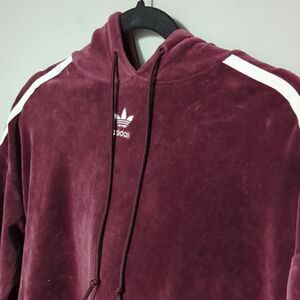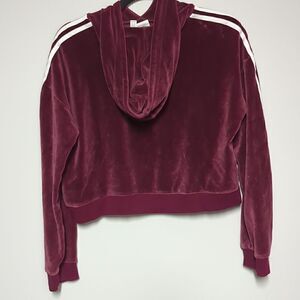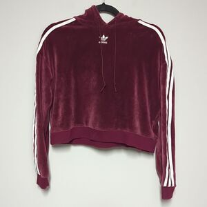 maroon cropped hoodie, white stripes down sleeves. Adidas logo on the front