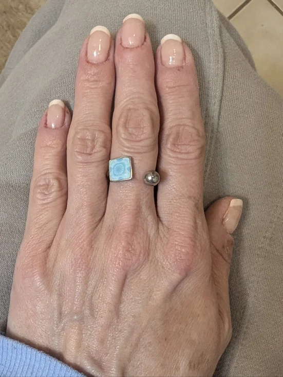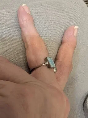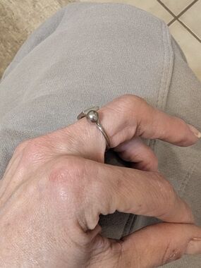adjustable ring. looks silver colored but you can see on the underside it's been worn off to the brass. doesn't affect how it looks on your hand. currently adjusted to about size 5.5