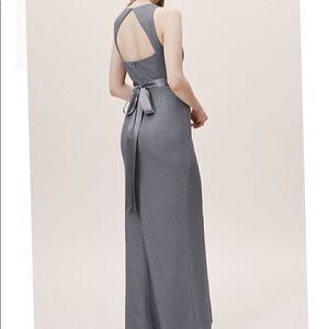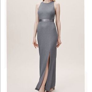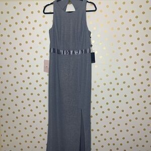 •Features: Sleeveless high neck with keyhole back. Color is hydrangea which is a gray/silver. Satin ribbon at waist. Hidden back zipper with hook eye closure.