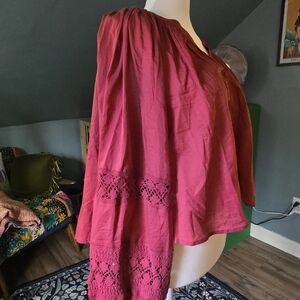 Lightweight peasant blouse with button-front closure. Gathered yoke and relaxed silhouette. Long sleeves with lace inset detailing. Feminine, flowy drape for everyday wear.
