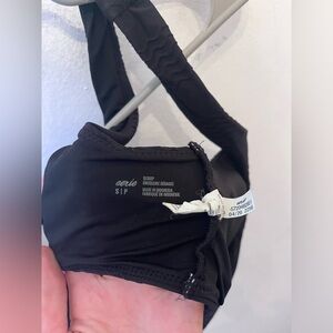 size small aerie scoop bikini top in black. has ribbed texture but is not see through!