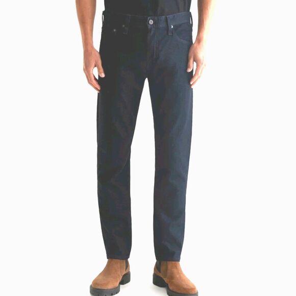 The AG Adriano Goldschmied 1783LEDSLR Tellis modern slim jeans in a dark wash. These jeans feature a solid blue color, slim fit, and a waist size of 34 inches. They are designed for men and have a zip and button closure. The modern slim style and slimming features make them a stylish and flattering choice for a contemporary look. Made in Mexico, these jeans are part of the Adriano Goldschmied collection and are known for their high-quality construction and fashionable design. Very very dark blue Japanese denim. Pre-owned.