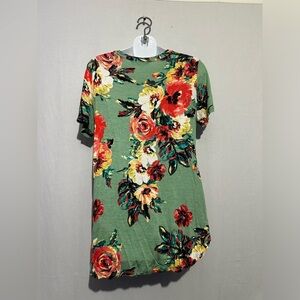 This tunic from a'gaci features a relaxed fit with a soft sage green base and vibrant red-orange floral accents. The asymmetrical design adds a unique touch, making it perfect for casual outings.