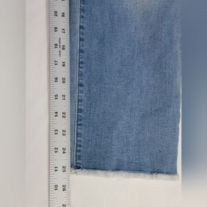 a:glow Maternity Girlfriend Capri Crop Denim Jean Size Large. Full coverage belly band, slim thru hip and thigh, hits below calf, front and back pockets, frayed hem, distressing at knees. Large 12/14
