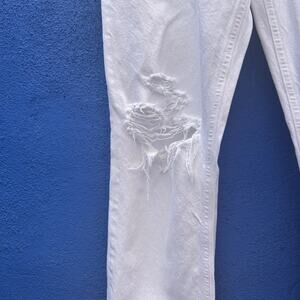 soft white organic denim / button fly / distressed at knees / high rise with a slightly tapered and cropped cut / excellent preowned condition