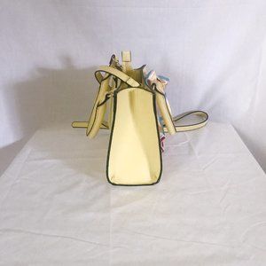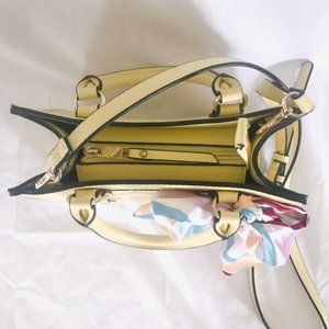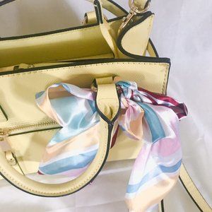 aldo yellow square crossbody with colorful satin bow and multi compartmental pocket.
