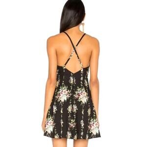 alice + olivia dress, black floral slip dress, size 6, camisole mini, crisscross back straps, feminine silhouette, balletcore trend, dark floral print, party, Vintage Bouquet & Black, Elena gilbert, vampire diaries, ASO, as seen on Elana gilbert, Nina Dobrev, celebrity