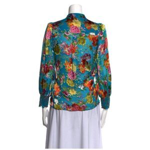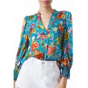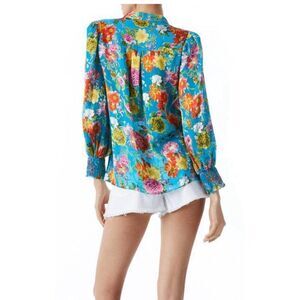 The product is a new authentic Alice + Olivia blue and pink Summer Bliss long sleeve top blouse in size XS. This stylish blouse is perfect for women looking for a chic and comfortable option for the summer season. With its vibrant multicolor design and long sleeves, it is a versatile piece that can be dressed up or down for any occasion.