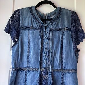 alice + olivia Tona Crocheted Patchwork Chambray Dress Size 12