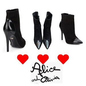 The product is a pair of Alice + Olivia black suede leather heeled boots in size EU 40/US 9.5. These stylish booties are designed specifically for women, featuring a sleek black color with leather lining, upper, insole, and outsole materials. The shoes offer a comfortable and fashionable option for any outfit, making them a versatile and chic addition to any woman's wardrobe.