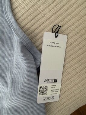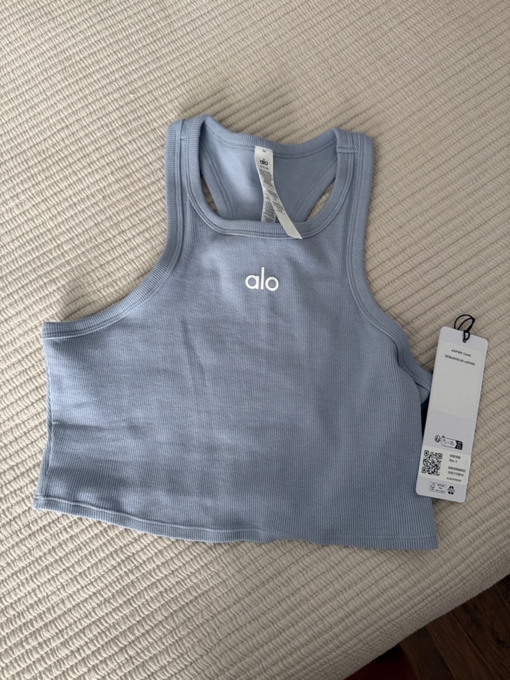 Soft ribbed fabric. Cropped racerback silhouette. Small reflective ALO logo at chest. Comfortable stretch for workouts or casual wear. Retails at $68