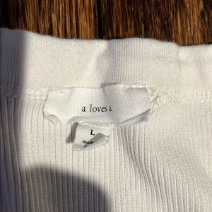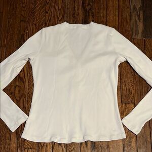 Excellent condition- no stains, tears or holes. This fitted long sleeve top in classic white offers a sleek and stylish look. Crafted from soft, ribbed knit material, it ensures both comfort and a flattering fit. Ideal for layering or wearing on its own, this tee is a versatile wardrobe essential.