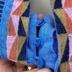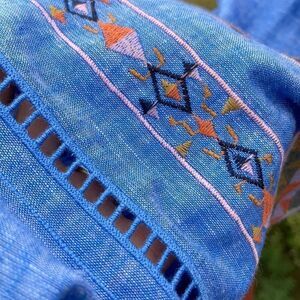 Crisp chambray colored linen with exquisite embroidered detail hard to capture in photos. Fabulous with leggings or jeans. Side zipper and sheer embroidery detail on front pocket and arms.