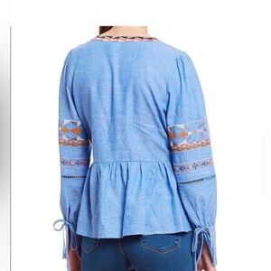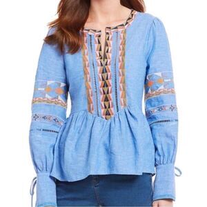Inimitable a loves a top, size large embroidered blue chambray linen