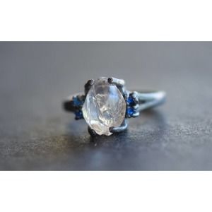This ring features four raw Hauynite / Hauyne gemstones around a raw California Diamond, set in solid sterling silver.