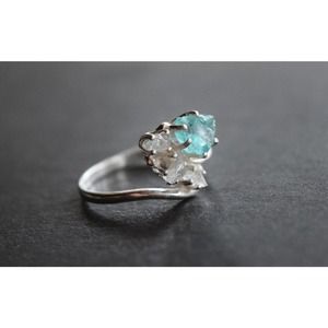 Completely raw and uncut, fresh from the earth Lake County Diamonds set around a raw Aquamarine stone, placed in a solid sterling silver crescent swirl band.