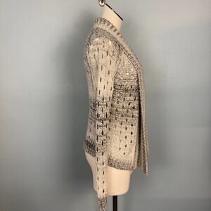 American Eagle Outfitters Wool Blend Open Front Open Knit Ombre Cardigan Women's Size XS Gray Cream Gold. Circle patterned open work knit cardigan sweater. Gradient yarns that provide a horizontal ombre effect in grays to creams and back again with gold threading throughout. Raglan sleeves. 41% acrylic, 15% wool, 12% nylon, 5% other fiber. Machine wash cold, lay flat to dry. In great, pre-owned condition. Measurements taken flat: pit to pit: 15", sleeve length: approx. 27", neckline to hem in center back: 22".