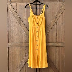 BRAND: a.n.a A New Approach SIZE: Medium CONDITION: NWT MATERIAL: 45% Rayon/ 40% Cotton/ 15% Linen Gold Button Up Linen Midi Blend Dress > Brown buttons all the way up > Midi length > Sleeveless with straps that can adjust to be criss crossed > Smocking in the back > Pockets > Machine wash TAGS: Midi, Cotton, Pockets, Retro, Smocked, Lunch, Brunch, Spring, Summer, Fall, Linen Approximate Measurements: Pit to Pit: 15 1/2” (measured flat) Length: 50" (strap to bottom hem)