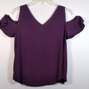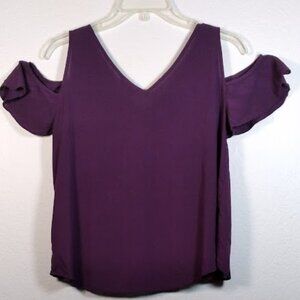 a.n.a A New Approach Top with Cold shoulders. Color: Eggplant purple Size: PM Fabric: 100% Rayon Ruffle sleeves V-neck pull over design Measurements: Front armpit to armpit: 18" across Side armpit to length: 12" Long approx. 2" longer in back Condition: Excellent as pictured, with no flaws Please see photos for better description 233-BX3