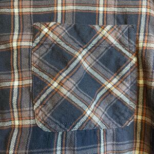 Keywords: a.n.a plaid flannel shirt, women’s large navy brown button down, casual layering shirt, fall flannel top, A New Approach flannel