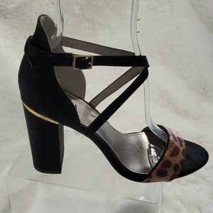 a.n.a "ADLER" Black faux suade, and a textured leopard print open toe heel. These stylish shoes have that fashion forward block heel, accented with Gold hardware measuring 4" high, and approx.1.75" wide.